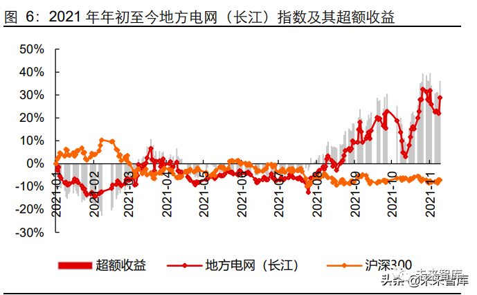 新能源发电表现仍稳健,文山电力点燃板块行情。新能源发电(指数)同期基本维持住 自己的累计超额收益,大市值成份股三峡能源和阳光电源表现依旧稳健,同时政策方面 依然有包括碳减排支持工具等暖风频吹。而地方电网(指数)在此阶段的逆势上扬,则 主要是受板块内文山电力重组复牌的影响,南网抽水蓄能资产的注入方案激活了整个地 方电网板块的上市平台价值。(报告来源:未来智库)