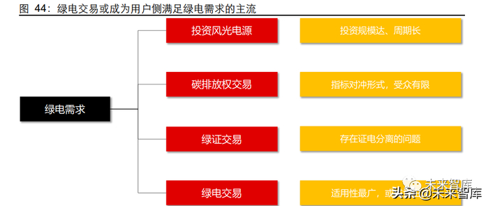 从当前的政策及市场机制来看,电力消费侧用户要实现降耗减碳,主要有以下四个途径:投资可再生能源、采购绿证、碳排放权交易和采购绿电。但其均有不同程度的局限性, 如可再生能源投资规模大、周期长,并且不同区域由于资源禀赋不同,很难在各个地区 均实现大规模风光电源的投资;绿证存在证电分离的问题,在核算终端实际碳排放认可 度较低;碳排放权是指标对冲形式,且参与受众较小;通过绿电交易市场适用性最为广 泛,且最接近本质减碳,因此绿电交易有望成为未来对于绿电需求的主要满足方式。