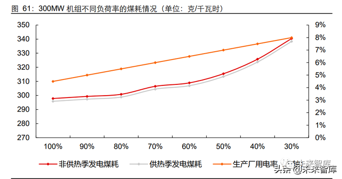 火电灵活性改造的目的在于开展深度调峰,而深度调峰成本包括增加的燃料成本、厂用 电、设备运营维护成本以及频繁启停带来的机组损耗。以 300MW 常规锅炉为例,随着 机组发电负荷率的持续降低,其无论是供热季的发电煤耗还是非供热季发电煤耗均有明 显的上升,并且随着机组负荷率的下降,其提升斜率有扩大趋势。除了发电煤耗上涨外, 机组厂用电率也会随着负荷率的下降呈明显上涨态势。并且在 30%的负荷情况下通常 需要投油助燃,使得煤电参与深度调峰的成本水平较高。除此之外,深度调峰的机会成 本还包括发电收益的损失,由于不同电厂盈利存在差异,因此机会成本也会有所不同。