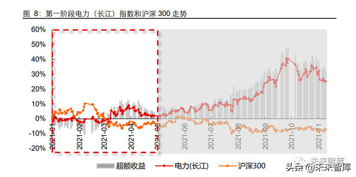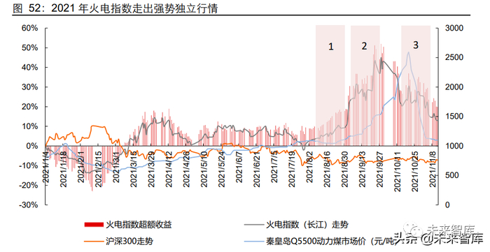 火电(长江)指数实现绝对收益 12.91%,跑赢大盘 20.11 个百分点,超额收益最 高曾于 2021 年 9 月 28 日达到 52.24%,2-4 月以及 8-9 月是全年超额收益的主要 来源;
