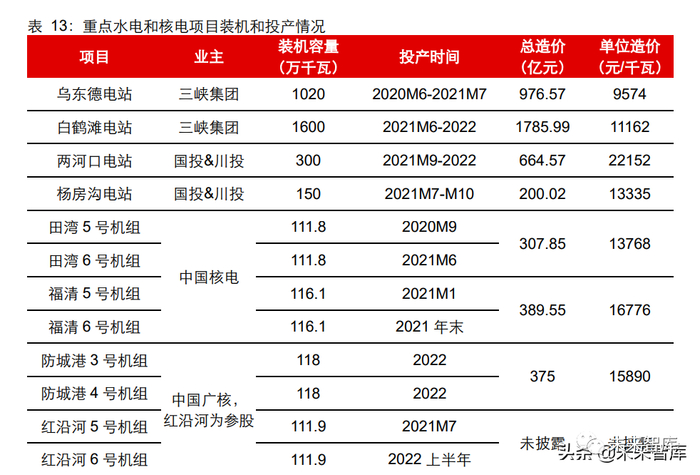 2020 年-2022 年是我国水电和核电项目密集投产的时期,其中包括金沙江下游乌东德 和白鹤滩电站、雅砻江中游杨房沟和两河口电站、中国核电旗下的田湾核电 5&6 号机组 和福清核电 5&6 号机组、中国广核旗下的防城港 3&4 号机组和红沿河 5&6 号机组。
