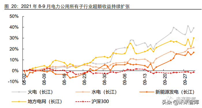 基于我们的划分,2021 年 8-9 月是行情演绎的第三个阶段,电力运营资产价值有待重 估走向市场的全面共识。在 2 个月的时间内,电力(长江)指数累计实现绝对收 益 24.51%、同期沪深 300 指数下跌 1.37%,行业跑赢大盘 25.87 个百分点。在全国多 地限电和能耗双控提升行业关注度的背景下,电价改革、新能源溢价以及火电转型三大 周期共振,电力公用行情如期迎来我们在《拥抱“碳中和”》系列深度研究中所提出的 “隧道尽头的光”。