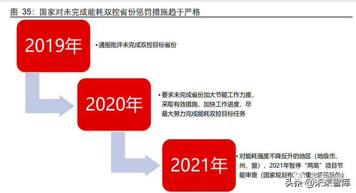 双控惩罚措施严格,重视程度有望提升。2019 年,能耗双控内蒙古考核结果为未完成 等级,国家发改委对考核结果为未完成等级的内蒙古自治区予以通报批评。在国家发改 委印发的《各地区 2020 年前三季度能耗双控目标完成情况晴雨表》中提出,各地区特 别是预警等级为一级和二级的地区,要坚决贯彻落实党中央、国务院决策部署,统筹处 理好经济社会发展和节能降耗的关系,在保障关系国计民生的重点项目和民生合理用能 的同时,进一步加大节能工作力度,采取有效措施,加快工作进度,尽最大努力完成能 耗双控目标任务。在《2021 年上半年各地区能耗双控目标完成情况晴雨表》及其印发 通知中,发改委要求对能耗强度不降反升的地区(地级市、州、盟),2021 年暂停“两 高”项目节能审查(国家规划布局的重大项目除外)。