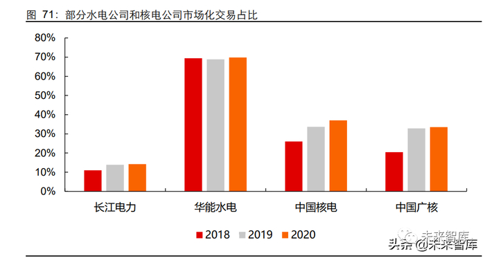 随着电力市场化的推进,水电核电也有部分电能参与到市场交易中,以主要水电与核电 公司的市场化比例来看,除了华能水电地处高度市场化的云南省、交易比例大致保持稳定以外,长江电力、中国核电和中国广核市场交易比例均有持续提升,到 2020 年已经 分别提升到了 14.21%、37.06%和 33.52%。
