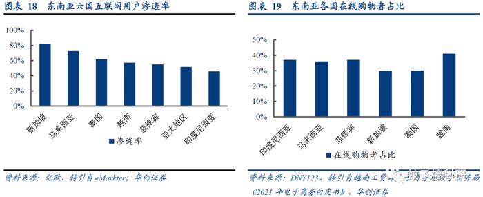 印度及东南亚电商市场有望蓬勃发展。截至2019年4月,东南亚六国(印尼、马来西亚、菲律宾、新加坡、泰国、越南)互联网用户渗透率均超过45%。较高的互联网渗透率为电商发展提供良好土壤。数据显示,东南亚各国在线购物者占比均超过30%。东南亚国家联盟电商零售占比从2018年的4%提升至2020年的9%,但距离中美20%以上的渗透率,后续提升空间巨大。再看印度市场,超过13亿的庞大人口基数叠加目前35%互联网普及率,尼尔森预测2025年印度互联网用户数据将达8.5亿。IBEF数据显示,2020年印度电商市场规模超过525亿美元,将有望于2025年突破千亿美元大关。