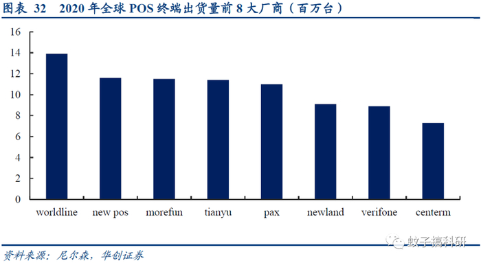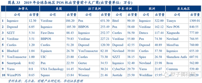 全球市场Worldline引领,华智融等国内厂商位列前茅。2020年全球POS出货量第一大厂商为Worldline(20年收购了Ingenico),国内厂商华智融(new pos)、魔方电子(morefun)、天喻信息(tianyu)、百富(pax)、新大陆(newland)分别位列2-6位。从2019年各地区出货量来看,天喻信息亚太第一,魔方电子拉美第一,Ingenico欧洲第一,Verifone美国第一。