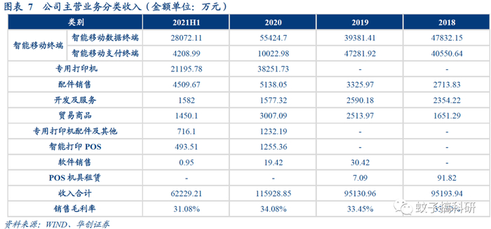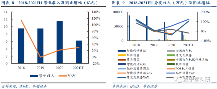 2018-2020年公司营业收入分别为9.52亿元、9.51亿元、11.59亿元。其中智能移动数据终端、智能移动支付终端以及专用打印机为公司营收主要来源,在2018-2021H1营收占比分别为92.85%、91.1%、89.46%以及85.93%。