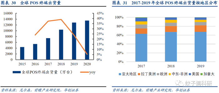 2020年全球POS出货量超1.35亿台,亚太、拉美占比较大。尼尔森数据显示,2020年全球POS终端出货量约为1.35亿台。地区分布上,亚太及拉美地区份额持续提升,分别从2017年的63%、12%提升至2019年的67.3%、14.7%。