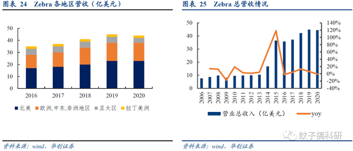 龙头厂商Zebra营收增长,北美等市场广阔。AIDC领域龙头公司Zebra成立于1969年,目前产品包括移动数据终端、条码扫描器和数据采集、打印机等等。通过直销和全球大约10000万渠道合作伙伴,Zebra产品可销售至全球约180个国家。伴随着AIDC相关产品的广泛使用,Zebra的营收规模从2006年的7.6亿美元上升至2020年44.5亿美元。从其收入地区分布来看,2020年,Zebra北美地区收入超过23亿美元,约占总营收的52%。