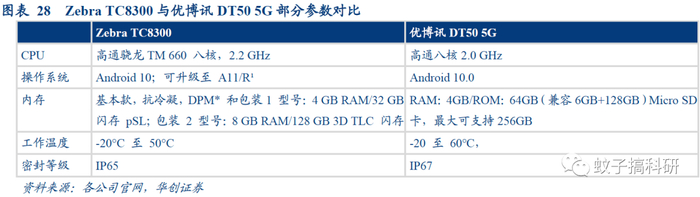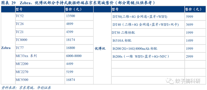 以优博讯、Zebra的手持式数据终端为例,国内厂商价格优势明显。此处我们以Zebra及优博讯的相关手持式数据终端为例,更好对比国内外厂商产品的价格差异。Zebra手持式数据终端型号众多,既有偏高端的TC77,也有较为基础款的TC26,京东商城上的售价在3000-20000元不等。优博讯智能数据终端同样拥有多系列,也推出了其首款5G PDA (型号为DT50 5G),京东商城上各系列产品的售价在1000-6000元不等。
