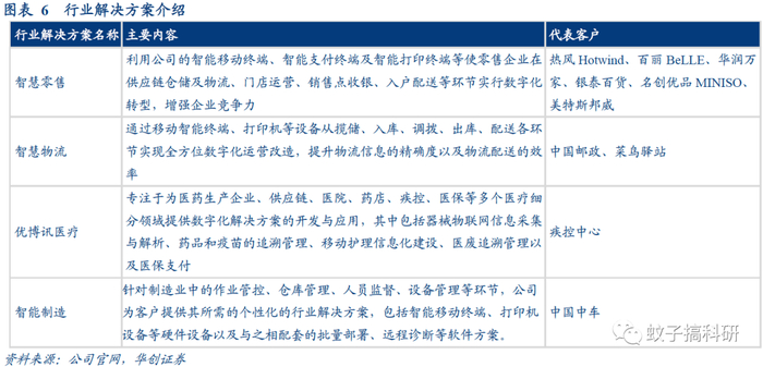 公司以自身研发生产的智能终端产品为载体,搭载基于行业客户定制化功能需求开发的应用软件,当前主要面向零售、物流、医疗、制造这四大行业推出相应的行业解决方案,当前均有可观的落地案例。