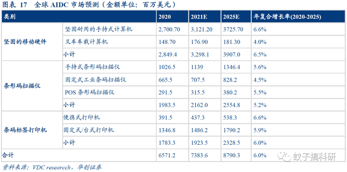 Zebra全球领先,国内厂商新大陆、优博讯等崭露头角。第三方一般以AIDC(automatic identification and data capture,自动标识数据采集)作为统计口径,VDC researcch预测AIDC硬件产品市场规模将于2025年达到87.9亿美元,2020-2025年CARG为6%。全球参与者众多,Zebra、Honeywell等海外厂商目前优势较大,但国内厂商优博讯等已跻身前20。