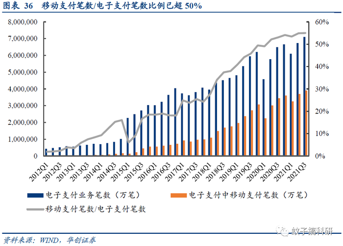移动支付蓬勃发展、多样化支付方式等催生智能POS需求。2021年Q3,我国移动支付笔数超过390亿笔,占电子支付笔数比例已超过55%,为历史新高。支付终端为完成移动支付的中心,随着二维码支付的不断普及,智能POS凭借全面的付款方式、系统更新较为方便等优势成为POS机发展趋势。