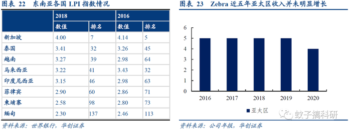 印度及东南亚物流基础设施发展加速PDA及配套需求,以斑马为代表的海外厂商并未建立绝对优势。根据世界银行LPI数据,泰国物流指数排名由2016年的45位上升至2018年的32位,提升明显;新加坡、越南、菲律宾2018年位次分别为7、39、60。LPI指数分为六项子指标(海关、基础设施、国际货运、物流能力、物流追踪、时效性),其中物流追踪则需要PDA信息采集支持。随着电商等加速,印度及东南亚PDA市场前景较为广阔。但从全球龙头Zebra的营收来看,其亚太地区的收入近5年均维持在4-5亿美元之间,没有大幅度增长,或许可以说明其在亚太地区并未建立绝对优势,国内厂商加速拓展或大有可为。