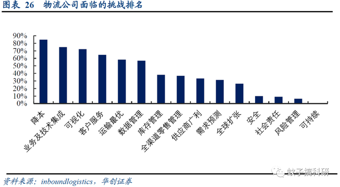 物流公司降本需求较大。调查数据显示,物流公司在信息化建设方面,降低成本、业务技术的集成、可视化需求较大,其中降本以84.7%的百分比位居第一。