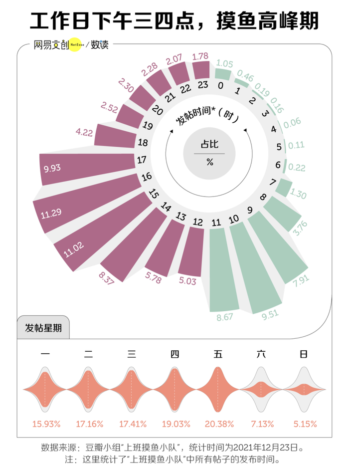通过统计豆瓣小组“上班摸鱼小队”里所有的发帖时间,就会发现这些摸鱼求助、分享的帖子,有两个发帖高峰——上午十点前后和下午三四点。