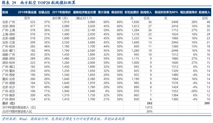 在2018年客运量基础、折扣率50-60%情形下,合计收入达到289亿,相当于南航2019年国内客运收入的40%,若提价10%,对应可增加29亿收入,对应超过20亿利润;