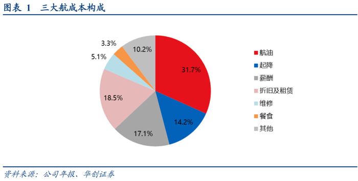 成本结构看:航空公司成本主要包含航油、飞机折旧(租赁费)、起降费、员工薪酬、维修费、餐食机供品和其他成本费用。通常“航油+折旧(租赁)+人工+起降”占据8成左右。