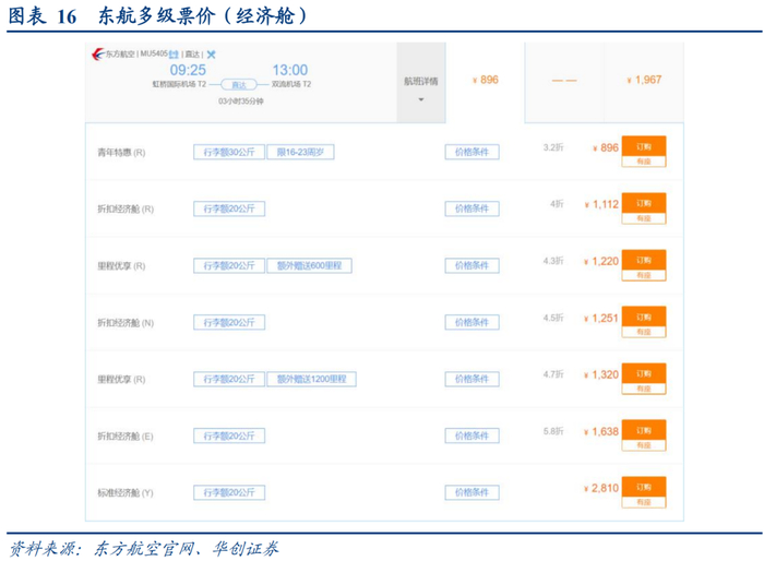 在市场细分后,航司就需要按不同的市场特征设计对应的运价产品,并给予差异化定价。以东方航空上海虹桥-成都双流机场的航线为例,仅经济舱就包含青年特惠、折扣经济舱、里程优惠和标准经济舱多款产品。