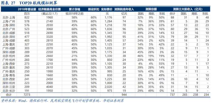 统计国内Top20航线,以2018年客运量基准,和假设实际票价水平,合计收入944亿元,其中国航265亿、南航238亿、东航234亿。