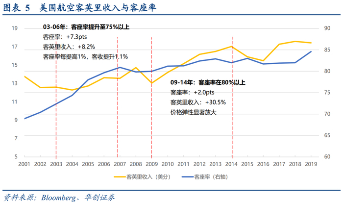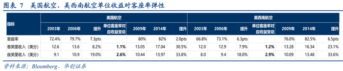 观察2003-2006年间,美国民航业客座率持续提升,客座率提高1%,对应票价(客英里收入)提升1.1-1.2%。