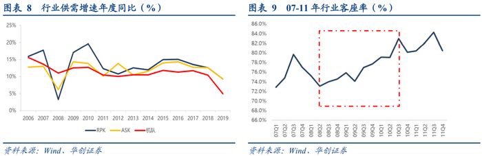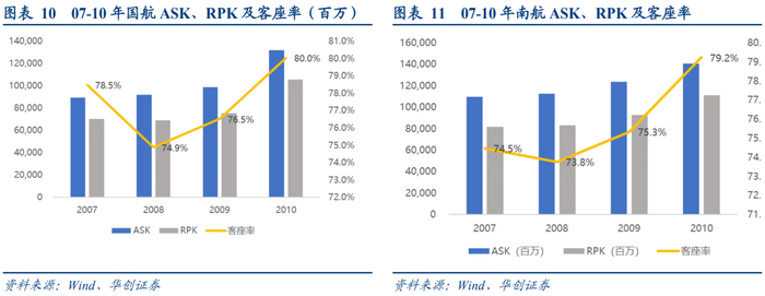 2010年行业RPK同比增速达到19.7%,ASK增速为13.8%,差异扩大至5.8个百分点。