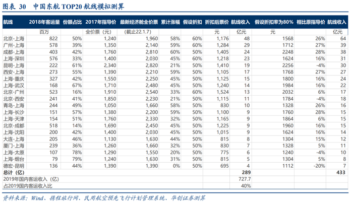 而一旦供需紧张,折扣率提升至80%,对应TOP20航线收入将达到433亿,增加144亿收入,对应超百亿利润增厚。