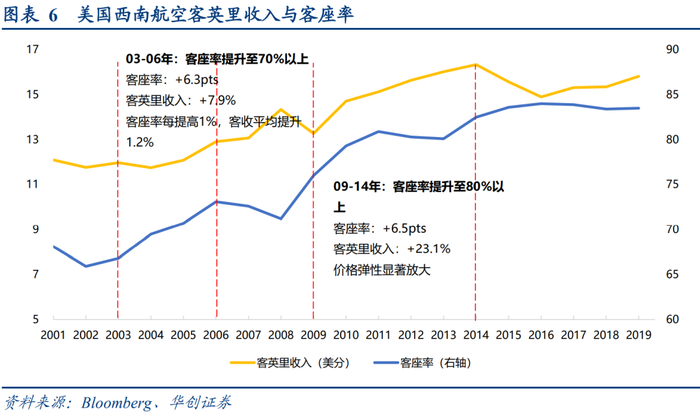 美西南航空客座率由2003年的66.8%提升至2006年的73.1%,合计提高6.3个百分点,客英里收入从12.0美分提升至12.9美分,累计涨幅7.9%,座英里收入从8.0美分上涨至9.4美分,累计涨幅18.0%;对应客座率每提高1%,客收平均提升1.2%,共同推动座收平均提升2.9%。