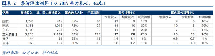 1)航空是具备典型高价格弹性特征的行业:成本结构相对刚性、价格一旦大幅增长,利润弹性较大。以2019年数据测算:假设票价提升1%,国航、南航、东航分别增加利润9、10、8亿。