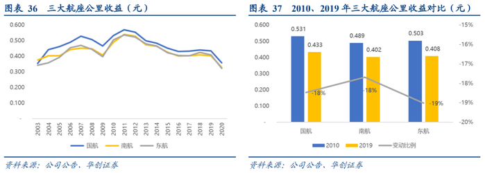 航空公司座公里收益水平在2011年见顶后,整体呈下降趋势。对比三大航2010年与2019年收益水平,座公里收益平均降幅18%左右(或0.1元)