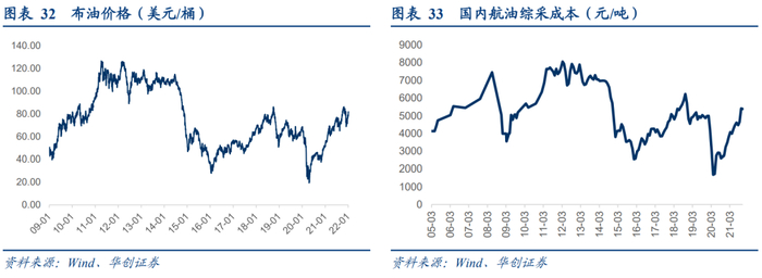 回顾2010年,平均油价为80元/桶,国内航油综采成本平均为5700元/吨,21年末布油价格与10年接近,综采成本5400元,略低于当年,预计2022-23年整体航油价格水平与2010年较为接近。