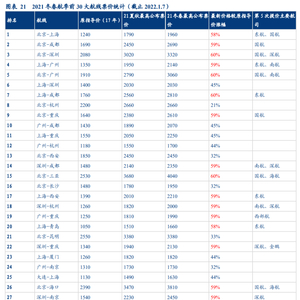 注:截止2022年1月7日,南航2021年冬春航季Top 20航线中,有4条航线较原指导价涨幅近60%,即提价5次;7条平均涨幅在45%左右,即提价4次;4条平均涨幅32%,提价3次;有4条调价2次,平均涨幅20%;仅1条未提价。累计提价超过30%的航线占比75%。