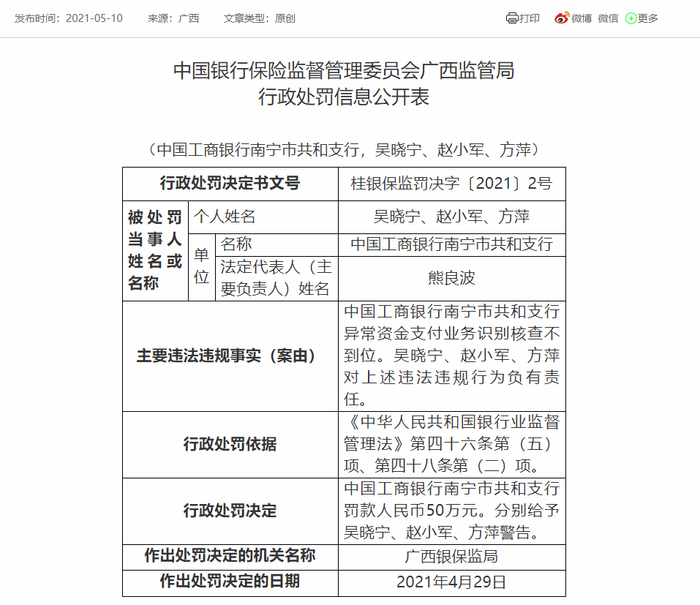 南宁分行共和支行因异常资金支付业务识别核查不到位,相关责任人被行政处罚