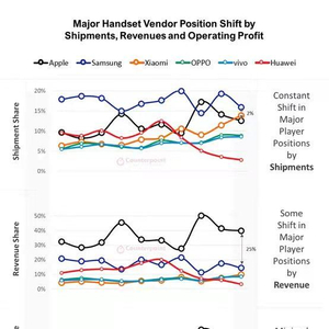 (近两年间六大主流品牌在全球分别的销量份额、收入、经营利润占比折线图,数据来源:Counterpoint Research)