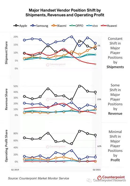 据调研机构Counterpoint统计,在2021年第二季度,尽管苹果对全球手机出货量的贡献只有13%,但却占据了整个手机市场75%的营业利润和40%的收入。在2020年第四季度的巅峰时期,得益于首款5G产品iPhone 12系列的推出,苹果甚至拿下了前所未有的86%利润份额。在全球市场中,虽然三星的收入份额此前一度在第二和第三之间徘徊,但利润占比也紧紧追随在苹果之后。