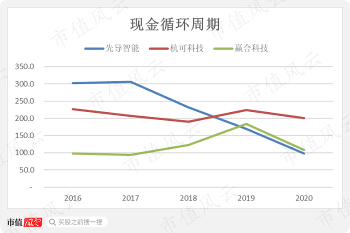 直观感受而言,先导智能显然是“顺风局”下天数持续下降最多、改善最明显的一家:从2017年的超过300天下降到2020年的不到100天。