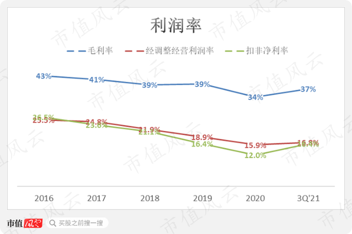 单从实际走向来看,2020年,伴随公司下游营收来源出现较大变动,毛利率下降了5个百分点,2021年前三季度有所回升,返至37%,公司的经调整经营利润率以及扣非净利率与毛利率变动基本一致。