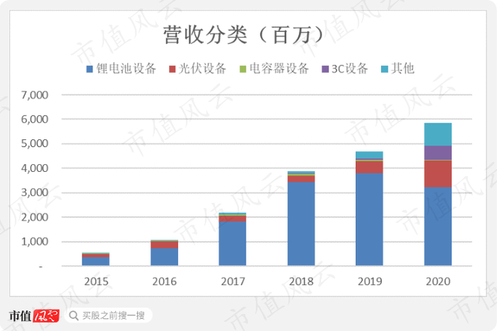 从公司营收来源来看,主要分为锂电池设备、光伏设备、电容器设备,以及3C设备这四大类。其中: