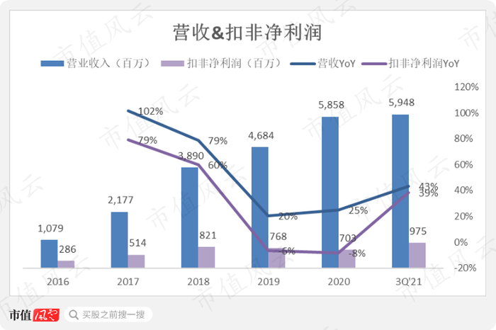 相比而言,公司的扣非净利润增速表现就要逊色得多,2016-20年间CAGR为25%,尤其是自2018年以来增速极其有限。