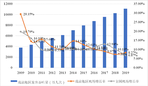 包立超分析认为,近年来,成渝机场群的航空运输需求旺盛、业务量稳步提高。航空客运方面,2009-2019年成渝机场群旅客吞吐量从3778.9万人次增加到11090万人次,年均增速达11.27%,略高于全国旅客吞吐量的平均增速(10.75%);2019年成渝城市群旅客吞吐量占全国的8.14%。航空货运方面,2009-2019年成渝机场群货邮吞吐量从57万吨增加到110.7万吨,年均增速达6.86%,2019年成渝机场群货邮吞吐量占全国的6.47%。