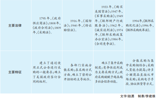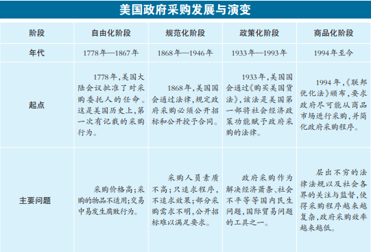 综上,美国政府采购历史可以分为四个阶段并浓缩为以下特征:自由化阶段经历了90年,采购方式与一般的商业采购无异;规范化阶段经历了60多年,采购方式主要为密封招标;政策化阶段经历了60多年,采购方式主要为竞争性谈判;目前处于商品化阶段,电子招标、协议供货等新型采购方式被引人政府采购中。每一阶段所要解决的主要问题不同,颁布的法律不同,相应地也就具备了各自不同的特点。