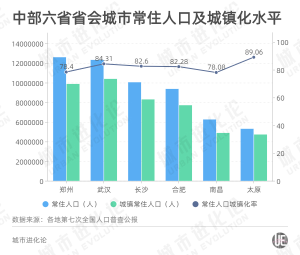从各地第七次全国人口普查公报相关数据来看,中部六省省会城市中,仅南昌和郑州两地常住人口城镇化率不足80%。其中,南昌常住人口625.6万,排名第5位;常住人口城镇化率78.08%,为6城最低。