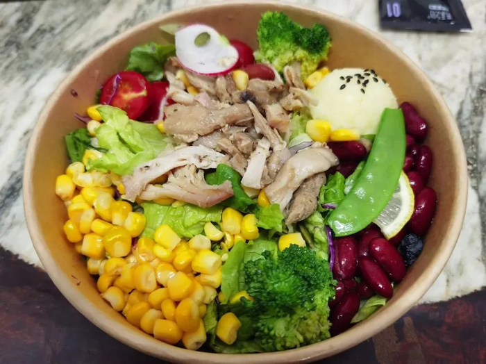 二三十块钱一份的外卖盒里,生菜叶子打底,铺上少油烹调的肉类,搭配点粗粮坚果,再浇一盒沙拉酱、油醋汁,看上去分外五彩缤纷,营养健康。