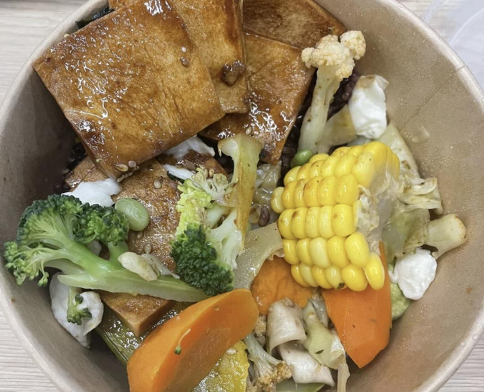 就比如前些天吃的这份,几块千叶豆腐,两缕西蓝花,一小块玉米,几块胡萝卜,下面铺一层紫米饭,美其名曰「海盐照烧豆腐水牛芝士热沙拉烤杂蔬配黑米饭」,到手价 32 元。