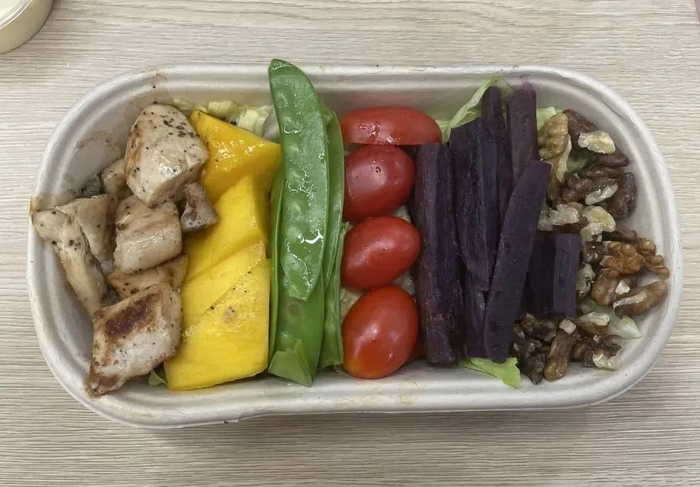 讲真,现在很多外卖的轻食,比起营养搭配,更讲究色彩搭配。红橙黄绿青蓝紫一应俱全,拍照是挺好看的。