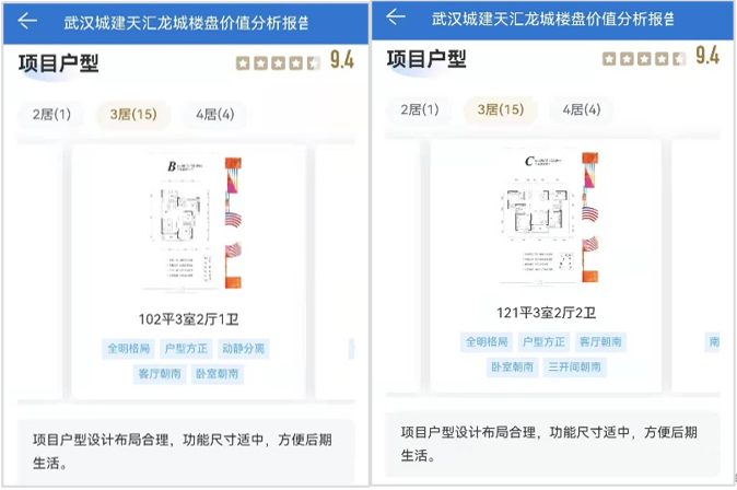 同时,项目户型产品力也较强劲,从楼盘价值分析报告中可以看到项目户型整体评分较高,户型方正,南北通透,三开间朝南,这也是项目热度较高的关键因素之一。