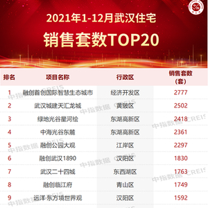 供应居高不下,市场竞争激烈,开盘去化降低,渠道分销盛行,网络营销创新不断,不少项目采取精改毛、频繁推盘、特价房等以价换量策略,造就了不少网红项目,国资及头部房企的竞争优势得到凸显。从具体榜单看,成交套数TOP20项目中,远城区仅占5席,中心区改善级项目表现不俗,光谷有5个项目上榜,汉阳区有4个项目,单价2万+项目也有上榜。20强上榜项目均为品牌企业开发,领跑军团优势突出,前5名销量均超过2000套,融创多个项目上榜,武汉城建集团旗下的天汇龙城以2502套强势上榜,凸显百万方大城的综合实力。