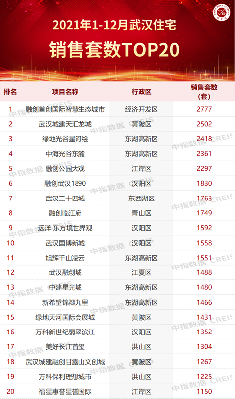 特别说明:武汉房地产项目销售数据统计是以2021年1月1日至2021年12月31日期间销售的商品住房为统计口径,主要依据中指数据CREIS(点击试用)在武汉市的销售监测数据;本报告仅供参考,课题组不对使用报告及其内容所引发的任何直接或间接损失承担责任。
