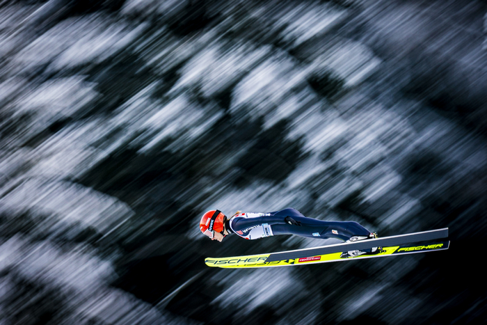 比赛时运动员两脚各绑一块专用的雪板,不用雪杖,不借助任何外力,以自身体重从起滑台起滑,经助滑道获得110公里/小时的高速度,于台端飞后,身体前倾和滑雪板成锐角,两臂紧贴体侧,沿自然抛物线在空中滑翔。