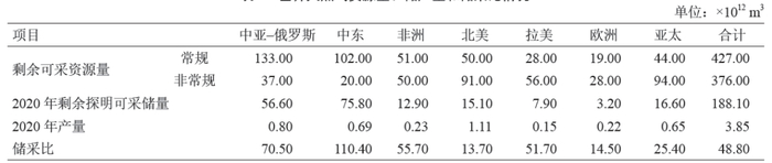 世界天然气资源储量极为丰富,特别是随着页岩气革命的到来,大幅提高了天然气资源的开采水平。世界天然气资源量、储产量和储采比情况如表 1所示。2019 年全球剩余常规和非常规天然气可采资源量共计为 8.03×1014 m3 ,2020 年剩余探明可采储量为 1.881×1014 m3 ;按照 2020 年产量(3.85×1011 m3 )估算,全球天然气储采比为 48.8,仍然维持在较高水平,具备持续发展的资源和储量基础。近年来,随着液化天然气(LNG)基础设施的不断发展,全球 LNG 出口国数量已超过 50 个,LNG 贸易量持续快速增长;近十年的年均增速为 6.8%,远高于管道气 1.8% 的增长速度。2020 年,LNG 贸易量达到 4.879×1011 m3 ,占世界天然气贸易总量的 51.9%,首次超过了管道气。未来,全球天然气产量将以年均 1.4% 的速度增长,预计 2040 年的产量将达到 5.4×1012 m3。全球天然气资源储量充足、产量持续增长以及天然气基础设施的不断完善,都为我国利用海外天然气资源奠定了良好的基础。